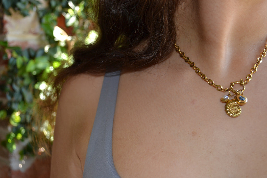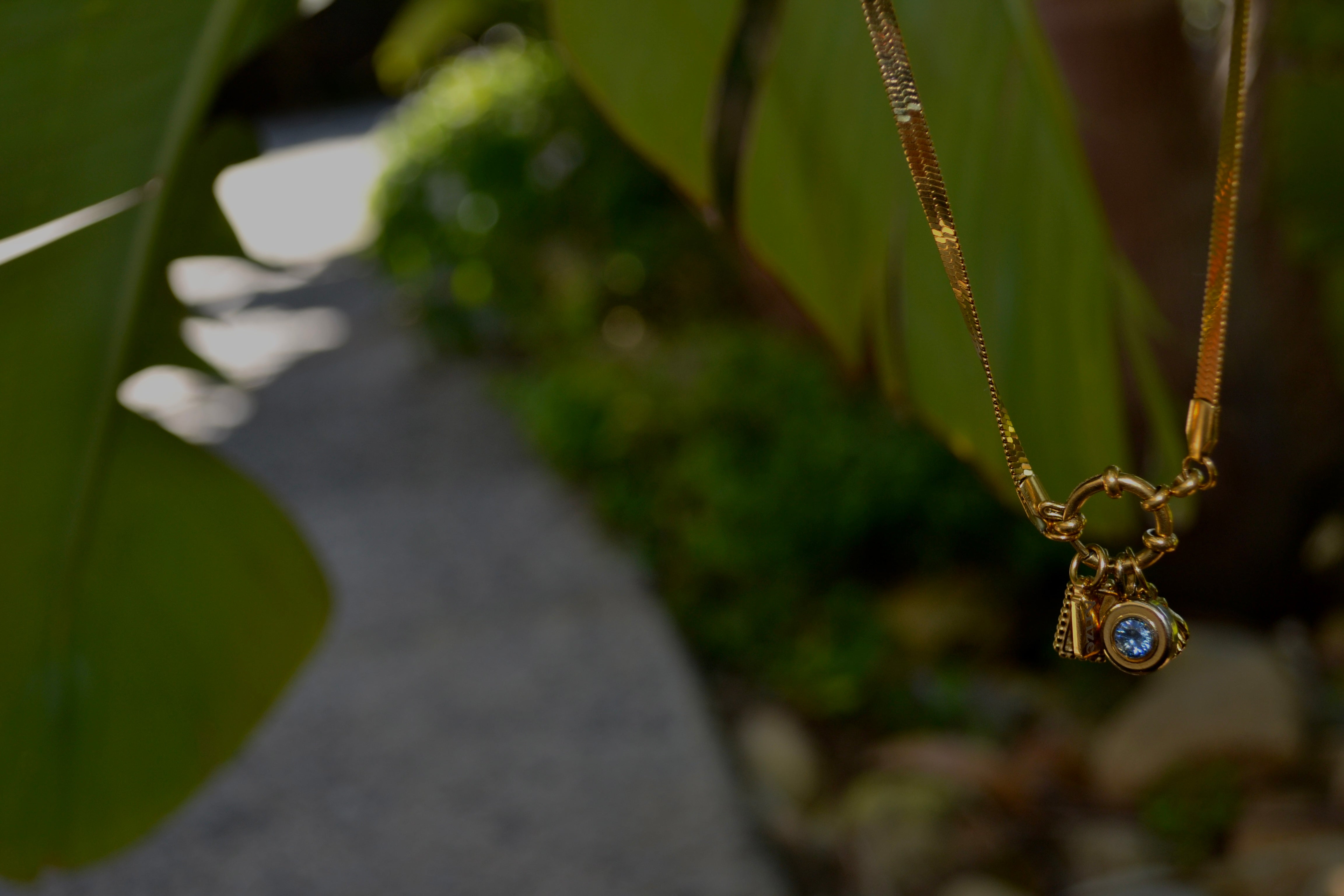 The Avalon Charm 💙 is deep, bold, and mysterious — a sapphire-blue stone set in golden glow, like the heart of the ocean at midnight. Waterproof, anti-tarnish, and effortlessly timeless — she’s made to shine every day, and you never have to take her off ✨