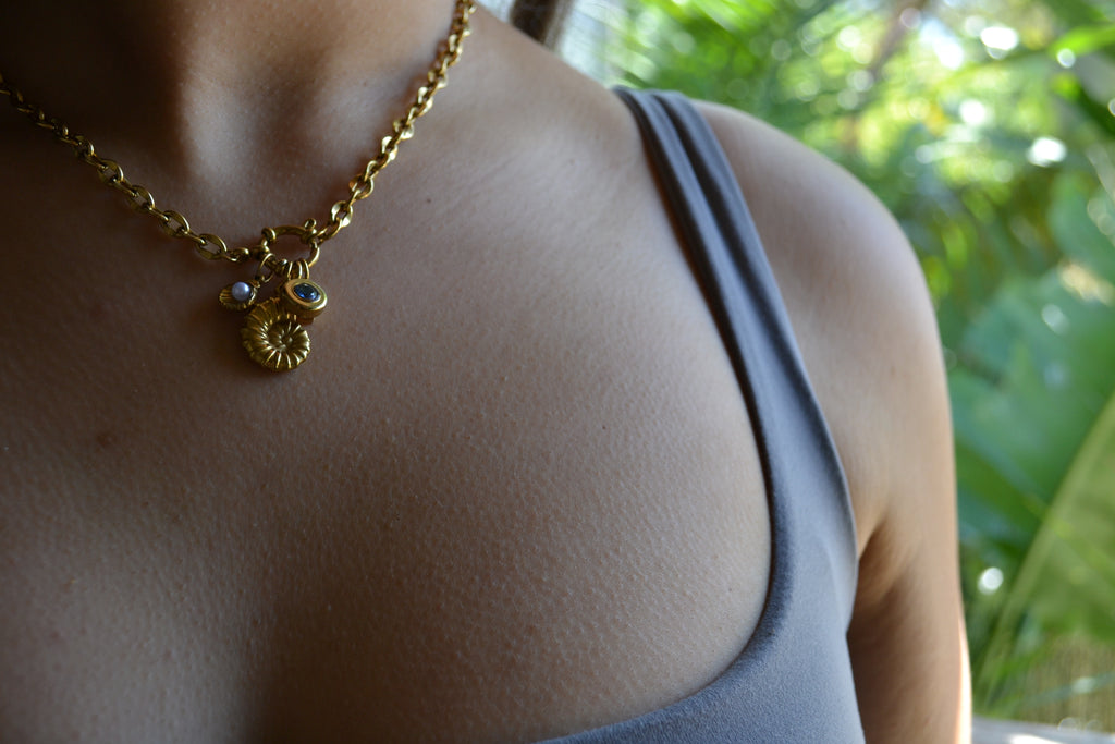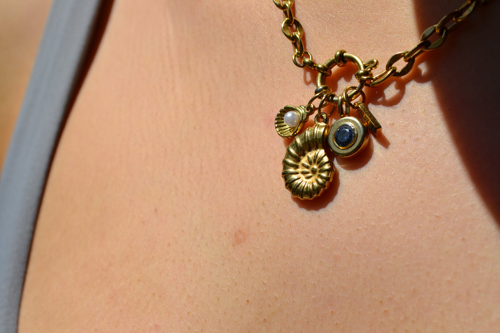 The Zora Charm 🌊 is inspired by the beauty of the nautilus — a golden design that shimmers softly beneath the waves. A true ocean keepsake, she’s elegant, unique, and made to bring a touch of seaside glow wherever you go. She’s waterproof, anti-tarnish, and made to stay with you always — you never have to take her off ✨