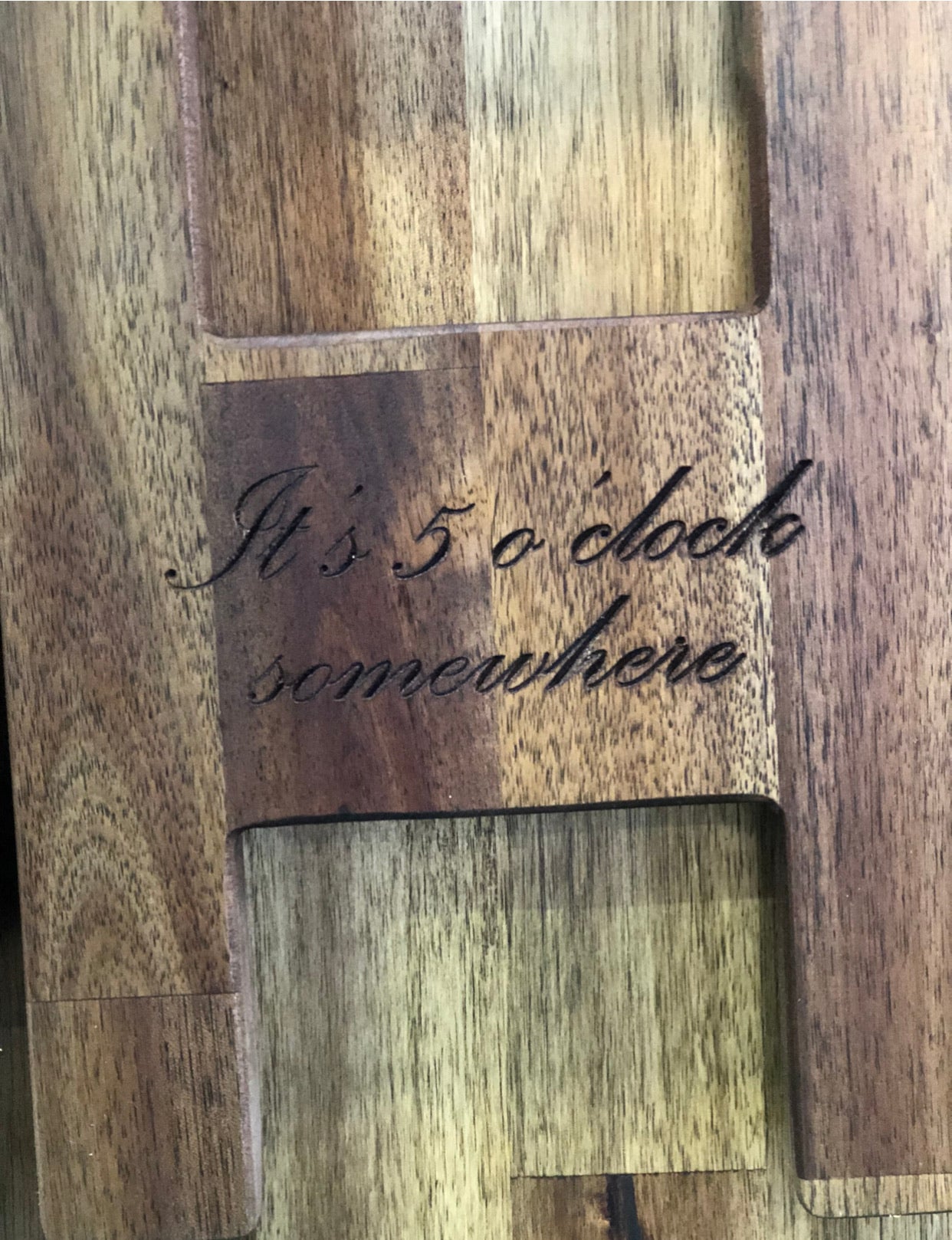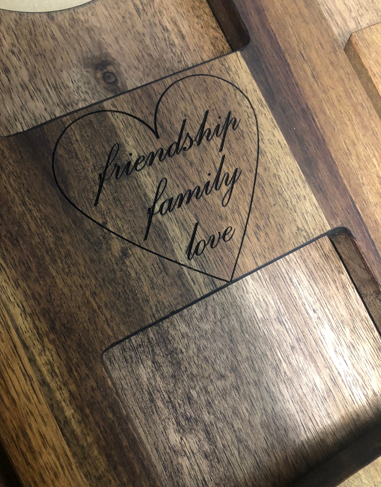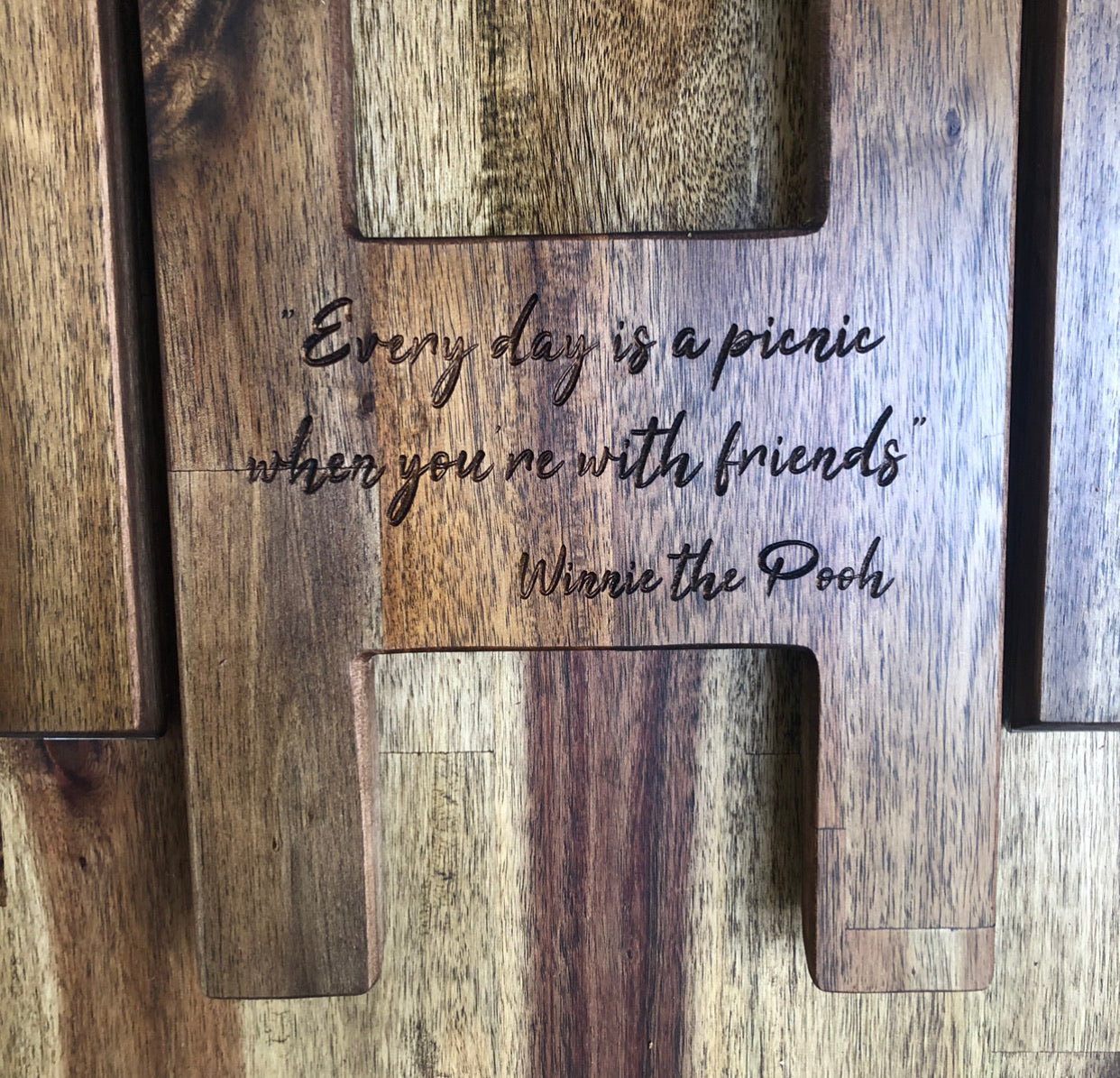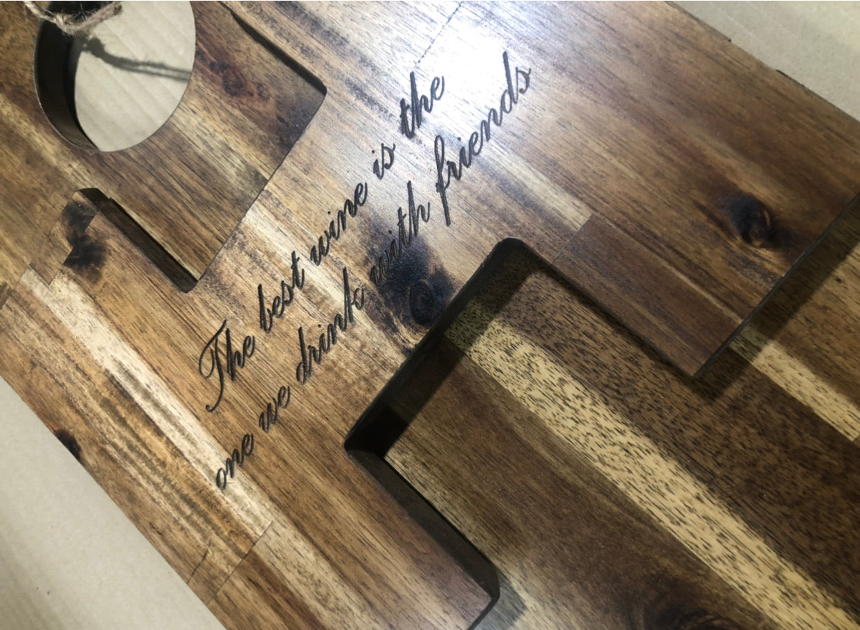All custom engraving will be engraved on the “H” leg. This is the most hygienic choice and your words won’t be covered by food when in use. Your words or design are engraved into the timber for an upmarket, quality finish.